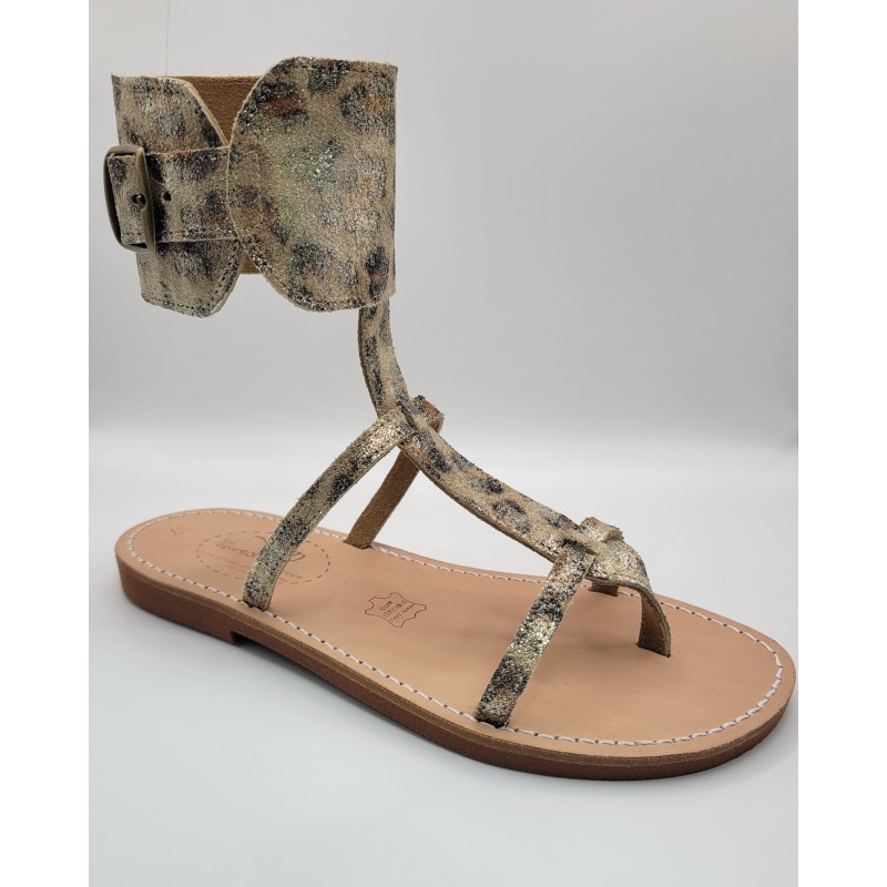 Sandale en cuir couleur léopard metallisé imprimé à brides multiples, avec bride montante et boucle ajustable à la cheville. Sa semelle plate en cuir assure confort et maintien, pour un style estival naturel et élégant au quotidien.